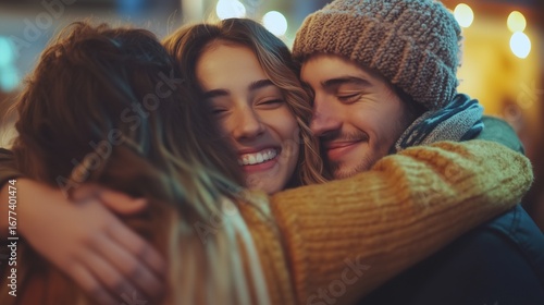 Three friends hugging and smiling. A group of friends embrace in a video gathered. A reunited field with a shallow depth of field. Three friends embracing each other with lifestyle joyful smiles.