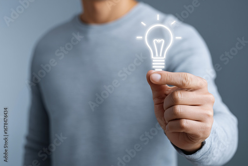 A person holding a glowing light bulb, representing idea or innovation. The person is wearing a gray sweater, symbolizing the human element behind this concept.