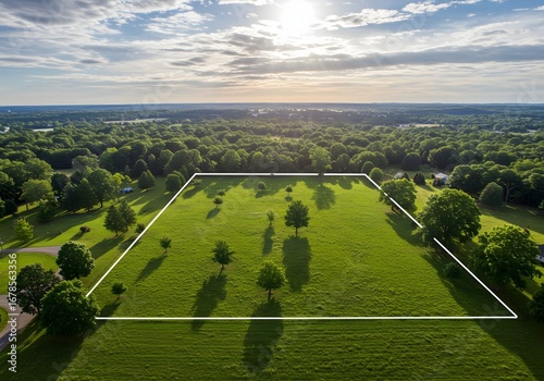 Aerial View of Land with Green Grass, Trees, Sunlight, and Boundary Lines for Real Estate, Development.