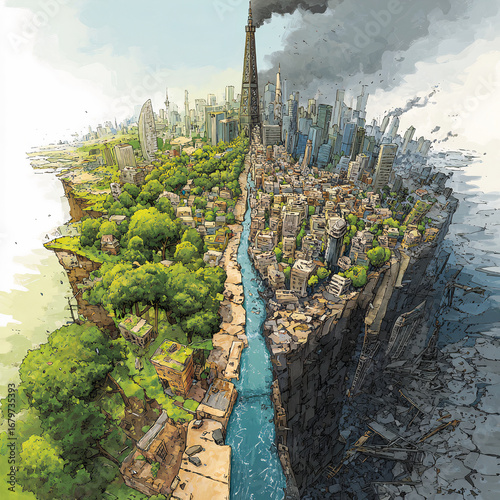 Detailed cityscape split by a deep ravine and blue river: left side lush green and sustainable, right side grey industrial megapolis with smoke.
