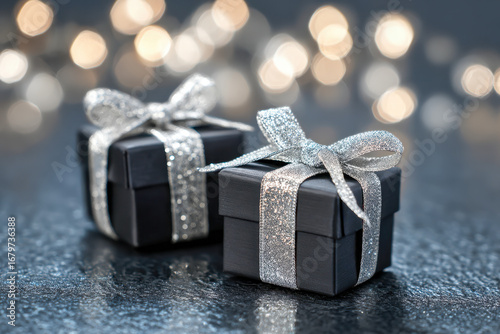 Elegant black gift boxes wrapped with sparkling silver ribbons presented on a reflective surface with festive blurred lights in the background celebrating special occasions and hol
