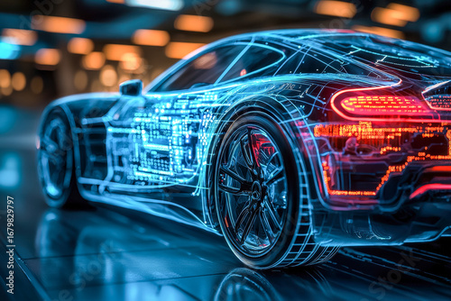 Futuristic digital rendering of a high-performance sports car with advanced technology elements