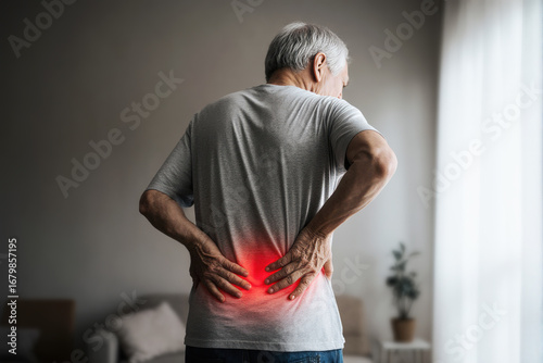 Lumbar intervertebral spine hernia, back pain, kidney stones, inflammation and disease, old man suffering from backache at home