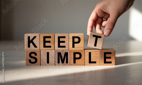 A hand places a wooden block with the letter 'T' onto a stack of blocks spelling out "KEEP SIMPLE