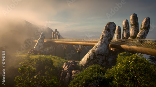 The iconic Golden Bridge in Vietnam, held by giant stone hands, spans a misty mountain landscape at sunrise.