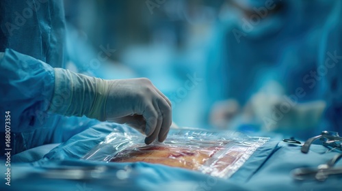Focused view of surgeon carefully applying a bioengineered cellsheet to the thoracic patch on patients rib cage surgical site slightly out of focus.