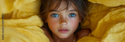 Captivating close-up portrait of young child with striking blue eyes and delicate freckles, softly framed by vibrant yellow fabric, conveying warmth and innocence with direct gaze.
