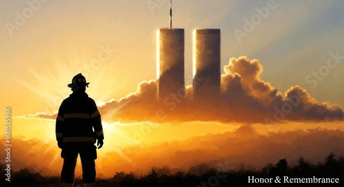 Firefighter Silhouette Honoring 9/11 Twin Towers at Sunset Patriot Day Remembrance
