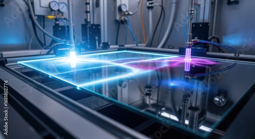 Smartglass electrochromic coating chamber with visible gas plasma treatment process inducing adjustable opacity on glass surfaces.