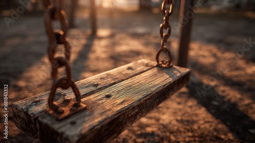 Old wooden swing hanging on rusty chains at sunset in abandoned playground – emotional nostalgic scene representing childhood memories, loneliness, time passage, lost innocence and conceptual storytel