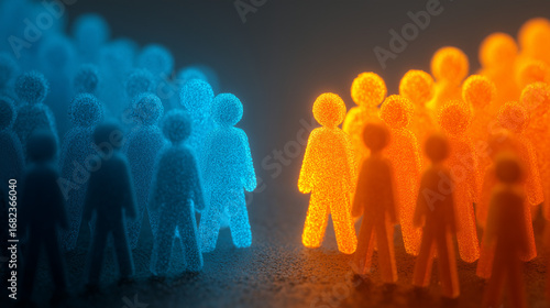 A visualization of in-group bias, with two groups of people favoring their own and showing hostility to the other.