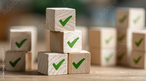 Stacked wooden blocks with green check marks indoor setting conceptual image focused viewpoint for clarity