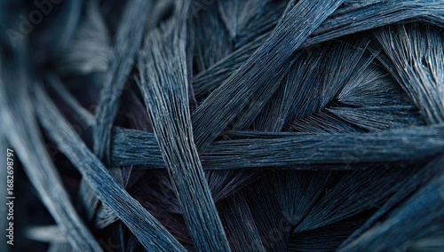 Close-up of intricate, dark-blue woven material. Intricate, tightly woven, dark-blue strands create a textured, three-dimensional sphere. Fine details of the weave are visible