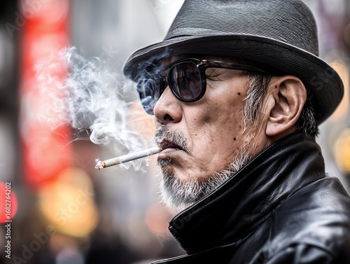 ハットとサングラスをかけ煙草を吸う渋い日本人男性