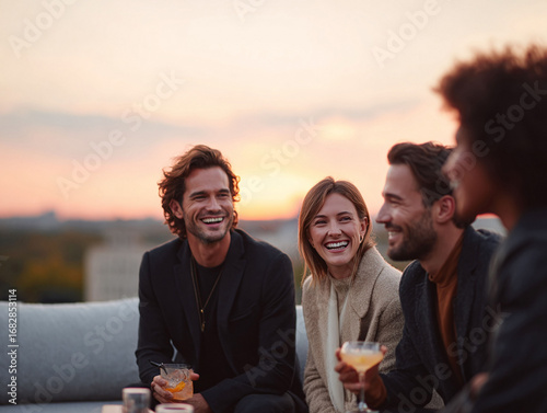 Stylish friends gather for rooftop cocktails at sunset, sharing laughter and camaraderie. Celebratory, aspirational, and perfect for lifestyle or social event concepts.