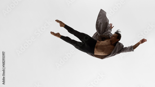 Male dancer floating horizontally in coat with focused gaze and emotional restraint. Concept of editorial menswear, performance art, psychological awareness, and somatic balance.