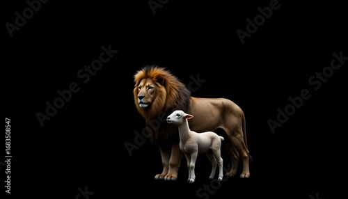 The image depicts a majestic lion and a gentle lamb peacefully standing side by side against a stark black background, symbolizing a harmonious relationship between unlikely companions.