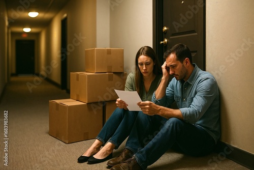 A couple of men and women received an eviction notice, sitting by the door to their apartment with packed boxes stacked.
