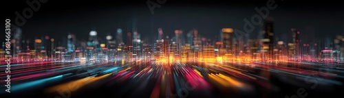 Digital transformation strategies for modernizing business concept. Vibrant city skyline at night with colorful light trails.