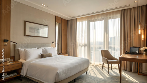 Luxurious hotel room with a comfortable king size bed and natural light streaming through sheer curtains