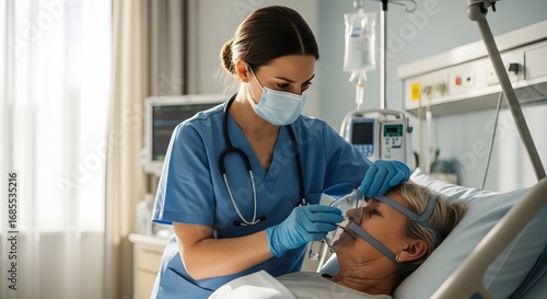 Nurse tending to a patient wearing an oxygen mask in a hospital bed with medical equipment nearby