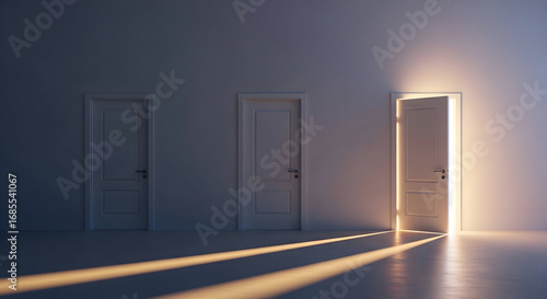 Three doors concept showcasing possibilities and choices with light shining through one open door symbolizing hope and opportunity
