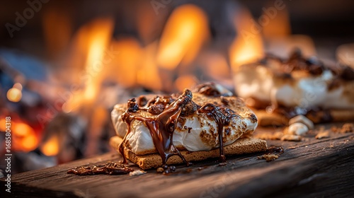 Close up of s mores with melting chocolate and toasted marshmallows by a campfire on a wooden board