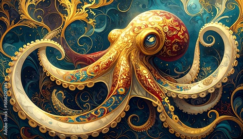 Majestic Golden Octopus Day Celebration with Intricate Patterns and Deep Blue Accents