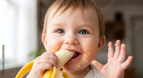 Baby Eating Banana with Messy Face Close-Up