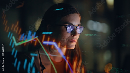 Stock market trader working hologram night closeup. Diagrams projected on face