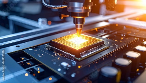 Close-up 3D render of microchip maker with glowing orange flare, futuristic semiconductor design, technology innovation concept in detailed digital visualization.