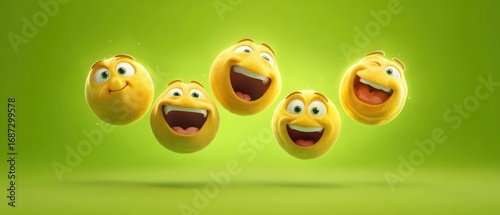 Group of five cheerful bright yellow emoticon emojis with laughing faces on vibrant green background, expressive happy mood, digital art