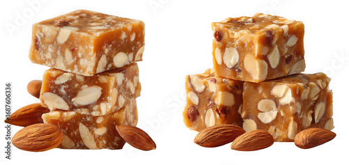 Stack of almond brittle candy with whole almonds scattered around, isolated on transparent background