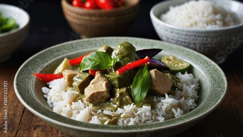 Green curry with chicken and rice in a bowl