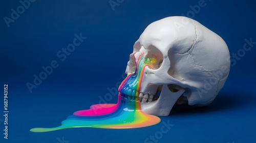 Creative surreal concept of a human skull on dark blue background with rainbow liquid melting from its mouth, symbolizing art, imagination, mortality, psychedelic vision, and creativity