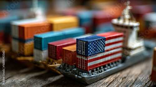 A miniature cargo ship carrying colorful containers including one with the american flag