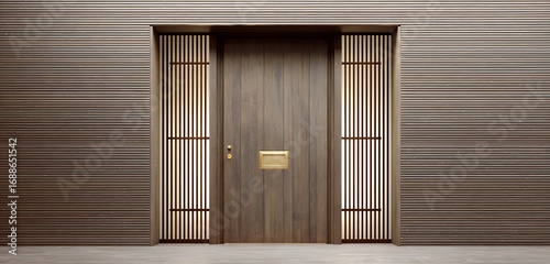 ultramodern bamboo door with charred finish, decorative bars, brass handle with acoustic insulation.