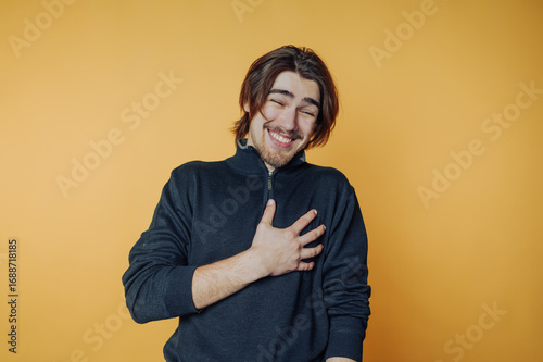 portrait of young man places a hand on his heart with a warm smile, showcasing sincerity and heartfelt emotions on yellow background