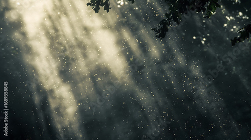 光に舞う雨粒と幻想的な木漏れ日