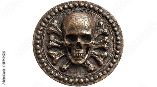 old pirate bronze medallion coin with a skull in the middle isolated on transparent background