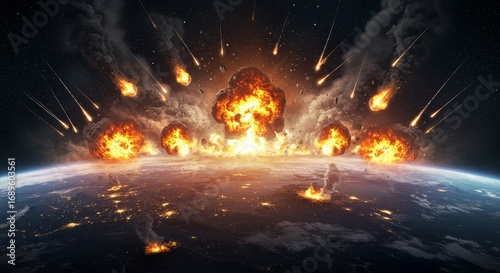 Meteors Strike Earth Global Devastation - Fiery meteors bombard Earth, causing widespread explosions and devastation. Symbolising apocalypse, destruction, impact, chaos, and extinction