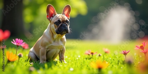 A charming fawn-colored canine companion, a young French Bulldog puppy, sits serenely amidst a vibrant meadow of colorful wildflowers bathed in sunlight.