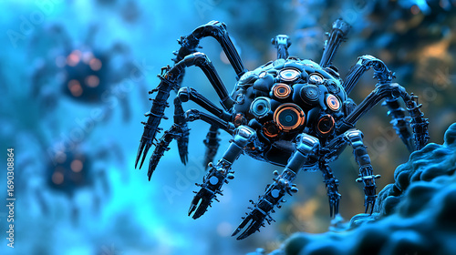 Virus-resembling nanobot attaching to host cell with gripping appendages