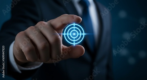 A businessmans hand holding a glowing blue target symbol with crosshairs, signifying focus, goals, and precision in business and strategy