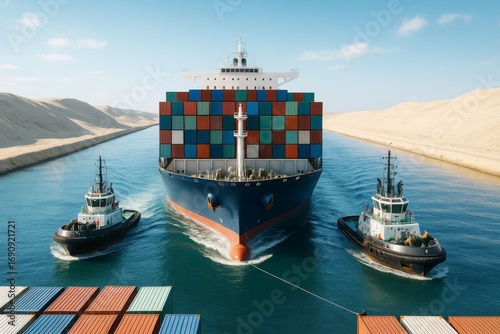Massive cargo ship escorted by tugboats through a narrow canal under bright daylight with desert landscape in the background. Ai generative