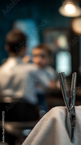 Close up of vintage metal barber scissors resting on a white towel in a dimly lit barbershop with blurred background