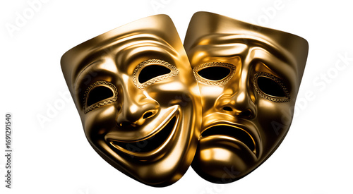 Golden comedy and tragedy theatre masks symbolizing drama performance arts symbolism transparent background