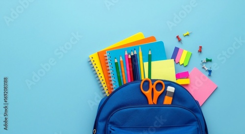 A vibrant assortment of essential school and office supplies spilling from a blue backpack, including colorful pencils, notebooks, and an eraser, arranged on a solid blue background