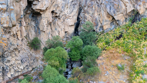 A high-angle view reveals a rocky ravine with a small stream running through it, surrounded by vegetation.