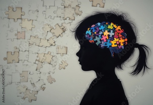 Silueta de niño con ilustración de cerebro con piezas de rompecabezas, colores vibrantes, sobre fondo liso, concepto de aprendizaje, resolución de problemas y crecimiento cognitivo
